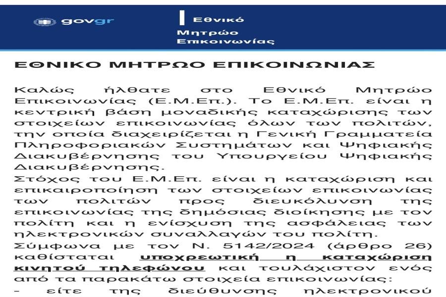 Όσοι ΔΕΝ επιθυμούν κάτι τέτοιο, θα πρέπει ΑΜΕΣΑ οι ίδιοι να εισέλθουν στο Έθνικό Μητρώο Επικοινωνίας (Ε.Μ.Επ.) και να το δηλώσουν ρητά έως το τέλος του έτους (31.12.2024) που είναι η διορία, μεταβαίνοντας στον παρακάτω σύνδεσμο: