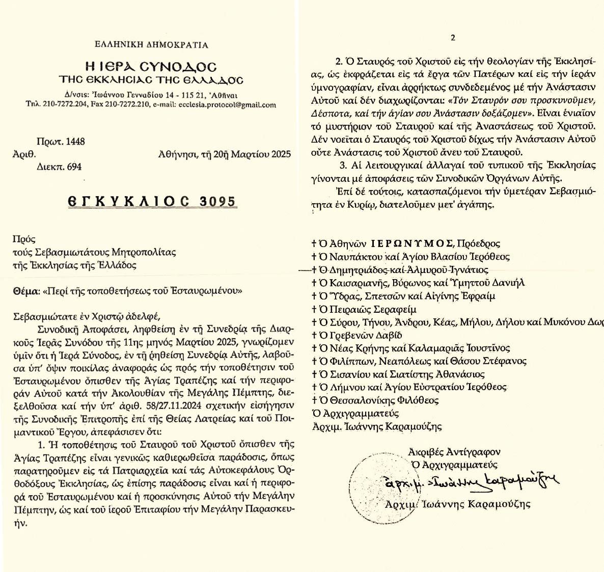 Στις 11/03/2925 η Δ.Ι.Σ. εξέδωσε Δελτίο Τύπου (https://www.ecclesiagreece.gr/ecclesiajoomla/index.php/el/iera-synodos/deltia-typou/synelthe-chthes-kai-semera-deutera-10-kai-trite-11-martiou-2025-e-d-i-s-tes-ekklesias-tes-ellados) και στις 20/03/2025 εκδίδει Ἐγκύκλιο, την ὑπ' ἀριθ. 3095/20.03.2025 μέ θέμα «Περί τῆς τοποθετήσεως τοῦ Ἐσταυρωμένου», την οποία την αποστέλλει σε όλες της Μητροπόλεις.