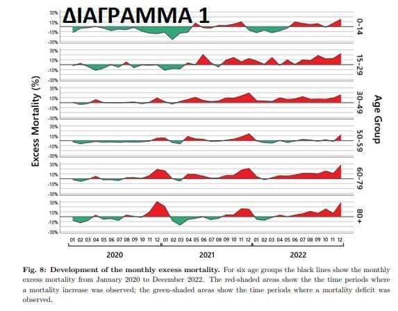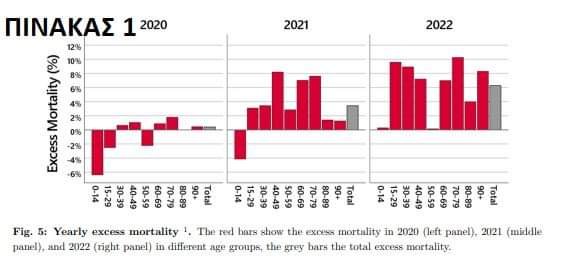 Ήδη από το 2021 και ιδίως με την έναρξη του προγράμματος εμβολιασμού τον Απρίλιο, είχε γίνει φανερό ότι παρατηρείται υπερβολική θνησιμότητα, κυρίως στις μεσαίες ηλικιακές ομάδες (διάγραμμα 1- πίνακας 1). Η τάση αυτή συνεχίστηκε το 2022, ιδίως στην ηλικιακή ομάδα 15-29 ετών. Τον Δεκέμβριο του 2022, 22,5% περισσότεροι άνθρωποι πέθαναν σε αυτή την ηλικιακή ομάδα από ό,τι αναμενόταν. Παρόμοια εικόνα παρατηρείται στις ηλικιακές ομάδες 30-49 και 60-79. Και ακόμη και στην ηλικιακή ομάδα 80+, όπου αρχικά οι φάσεις υπερβάλλουσας θνησιμότητας αντισταθμίζονταν πάντα από επόμενες φάσεις ελλείμματος θνησιμότητας, αυτό άλλαξε το 2022. Και εκεί στη συνέχεια παρατηρείται μια ανησυχητική σταθερή αύξηση μέχρι το τέλος Δεκεμβρίου 2022.