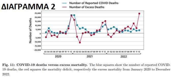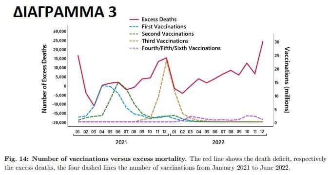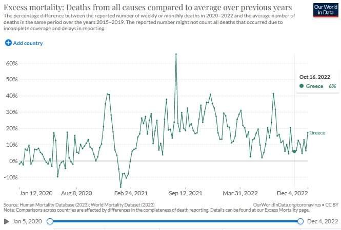 Aπό την ίδια πηγή δεδομένων, η Ελλάδα εμφανίζει 7,2% υπερβάλλουσα θνησιμότητα το 2020, πρώτη χρονιά του covid, που συνοδεύτηκε με αυξημένη θνησιμότητα, η οποία εκτοξεύεται στο 18,6% το 2021, πρώτη χρονιά του προγράμματος εμβολιασμών αλλά και επίσης αυξημένης θνησιμότητας λογω covid, όμως παραμένει υψηλή στο 15,5% το 2022 (6), ενώ επικρατεί η μετάλλαξη Όμικρον, που εμφανίζει παγκοσμίως χαμηλή θνησιμότητα. Ποιό είναι ένα κοινό χαρακτηριστικό των ετών 2021 και 2022, που λείπει απο το 2020; ο εμβολιασμός με τα εμβόλια covid. Στην Ελλάδα, το 74% έχει ολοκληρώσει τουλάχιστον ένα πρωτόκολλο εμβολιασμού και το 76% έχει κάνει ένα τουλάχιστον εμβόλιο (7).
