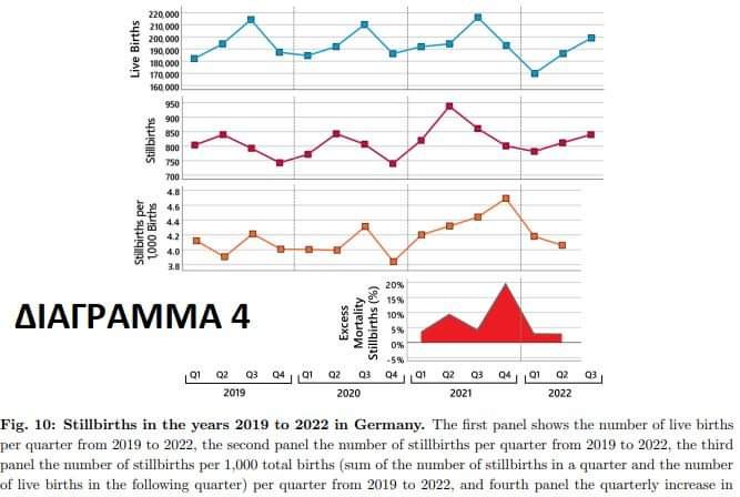 Η ήδη γνωστή μαζική μείωση του αριθμού των γεννήσεων ζώντων παιδιών κατά το πρώτο τρίμηνο του 2022 - ακριβώς εννέα μήνες μετά την έναρξη της εκστρατείας εμβολιασμού - φαίνεται στο διαγραμμα 4, και η οποία συνεχίζεται και σήμερα.Το τρίτο τρίμηνο του 2022 γεννήθηκαν ζωντανά 14.500 λιγότερα παιδιά από ό,τι κατά μέσο όρο τα προηγούμενα έτη 2019-2021. Η πορεία της θνησιγένειας (τοκετοί νεκρών εμβρύων) είναι επίσης εντυπωσιακή, αλλά και διαφορετική. Παρατηρείται μια ξαφνική αύξηση το δεύτερο τρίμηνο του 2021 στο 9,4% (έναρξη των εμβολιασμών), η οποία συνεχίζεται και φτάνει στο 19,6% το τέταρτο τρίμηνο του 2021.