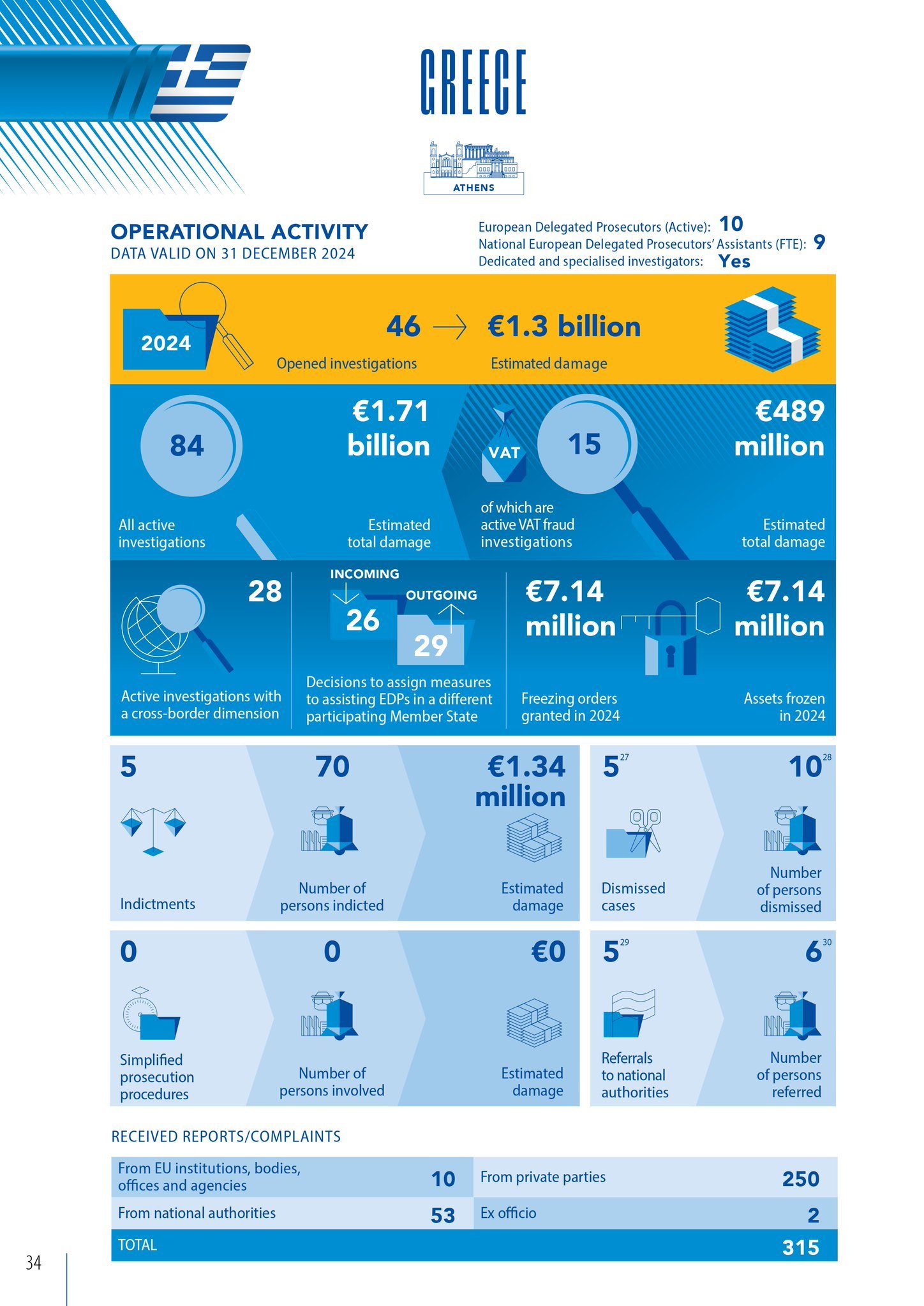 Στην ετήσια έκθεση της Ευρωπαϊκής Εισαγγελίας αναφέρεται ότι κατά το 2024 η υπηρεσία ξεκίνησε στην Ελλάδα 46 έρευνες με κατ’ εκτίμηση ζημιά ύψους 1.3 δισ. ευρώ. Συνολικά τρέχουν 84 έρευνες με εκτιμώμενη ζημιά 1.71 δισ. ευρώ.