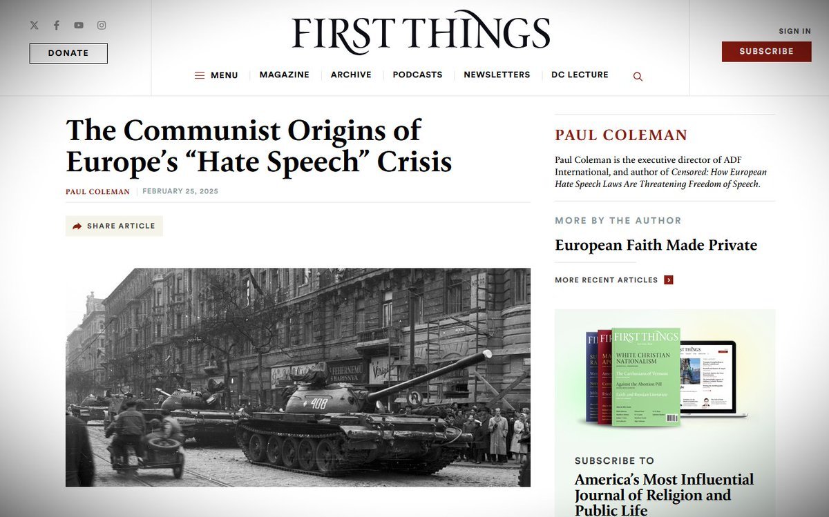 O Δικηγόρος Paul Coleman (έχει μετάσχει σε δεκάδες δίκες στο Διεθνές Ποινικό Δικαστήριο, στο Ευρωπαϊκό Δικαστήριο Ανθρωπίνων Δικαιωμάτων, στο Δικαστήριο της ΕΕ, στο Διαμερικανικό Δικαστήριο Ανθρωπίνων Δικαιωμάτων, κ.λπ.) δημοσίευσε στο αμερικανικό περιοδικό First Things ένα αξιόλογο άρθρο για τις κομμουνιστικές καταβολές της σύγχρονης λογοκρισίας στην Ευρώπη και εν γένει στα δυτικά κράτη με την επίκληση της καταπολέμησης της «ρητορικής μίσους»!